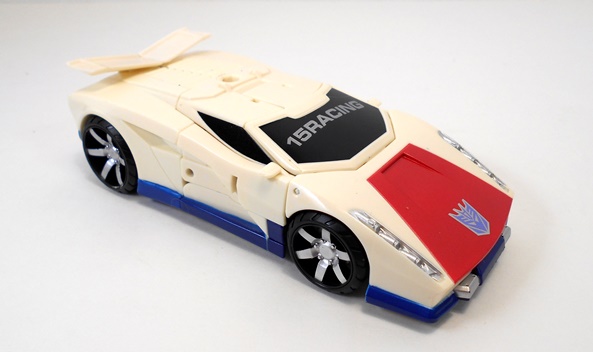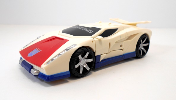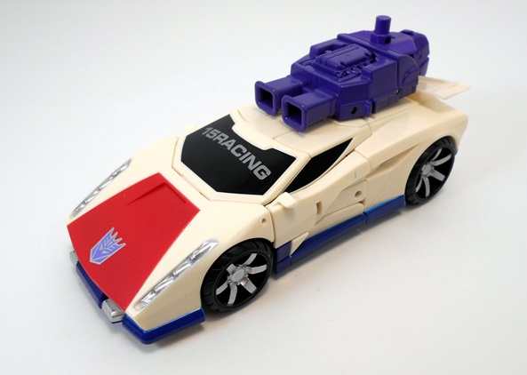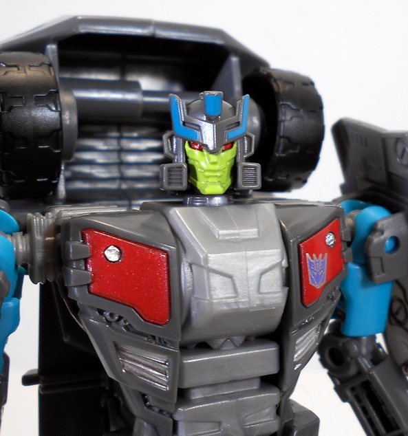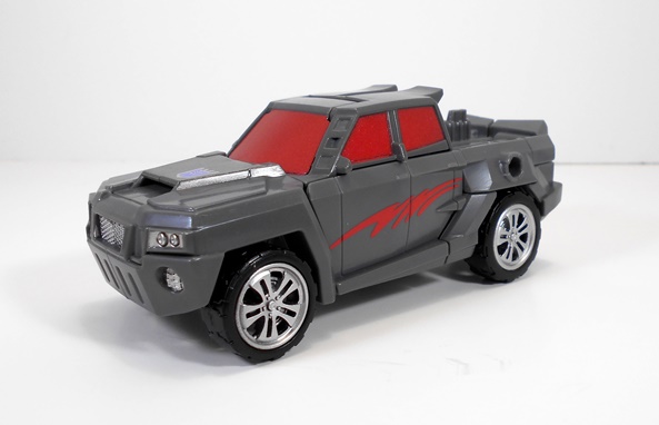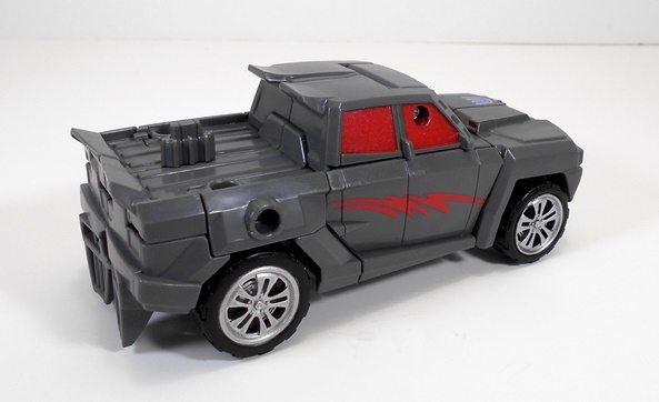 This is certainly not a bad looking little truck. The detail in the front grill, headlights, and bumper is pretty good and I really like the wheels. It’s also worth mentioning that with his charcoal colored body and red painted windows, Hasbro did their best to give him G1 Wildrider’s colors. Hell, he even sports the same off center Decepticon logo on his hood. Still, Offroad manages to bust out on his own a bit with those red color splashes on his doors. The alt mode holds together quite tightly and rolls along great.
