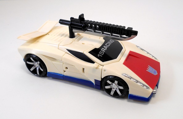 Offroad comes packaged in his robot mode with his weapon and combiner part beside him, all plastered in front of a lovely free comic book. At least the back of the package has a blurb about Offroad that admits he’s the newest member of the team, not like some Poochie that they tried to retcon in without thinking we would know about it. But hey, he’s a Decepticon car and by my very nature I love Decepticon cars. That philosophy hasn’t failed me since Hasbro decided to repaint Armada Sideswipe into Oil Slick. *shudder* Anyway, this is case where my outlook is still fairly optimistic. Let’s start with his alt mode.