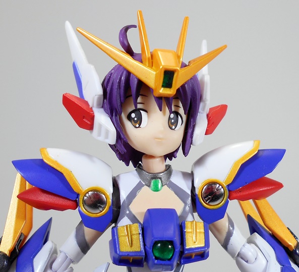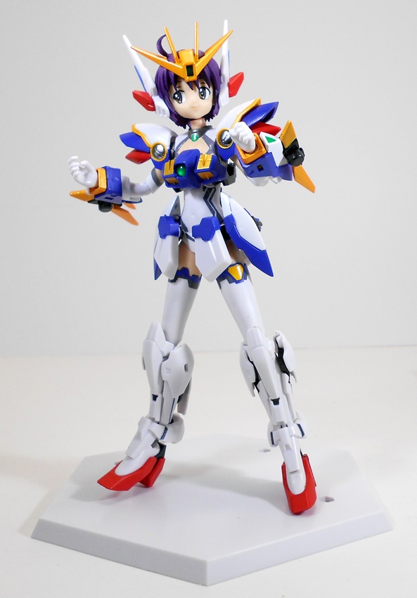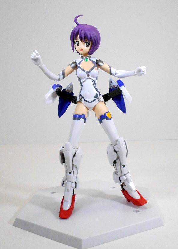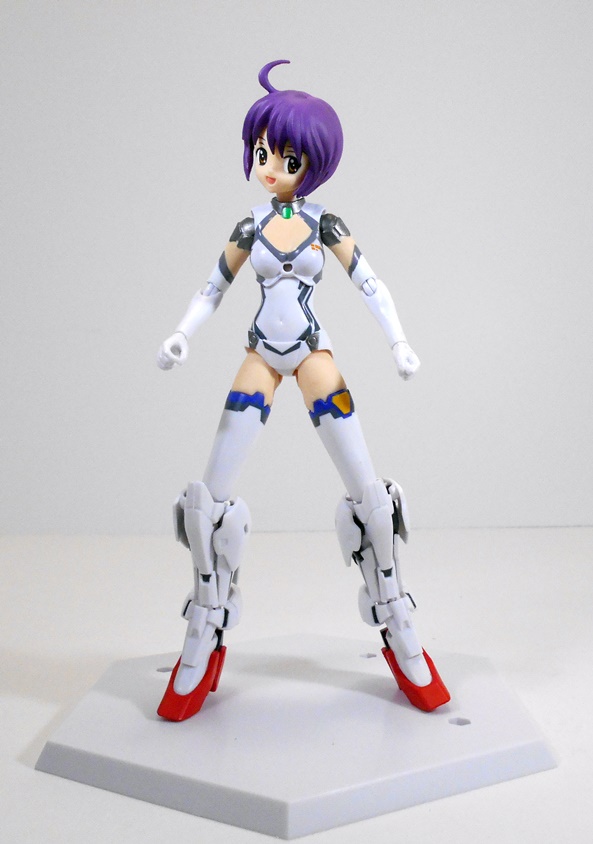 The figure definitely has a Figuarts feel to it only not quite as refined. She’s wearing what reminds me of a typical plugsuit-type outfit that a lot of these young gals piloting mechs seem to wear these days. The figure features some nice paintwork and detailing, and is quite solid with stiff joints and the ability to stand beautifully on her own. The head sculpt is typical cutesy fare with purple hair and a cowlick blowing up on the top of her head. While there are two heads included (one armored up and one regular), you can use either portrait with either head. I tend to go with the happier one for the base figure and keep the other portrait in the armored up head. The face and hair swap is handled much the same way as any Figuarts or Figma figure, although I’m not crazy about the way the head uses an angled peg to secure it as it leads to some floppy head syndrome.