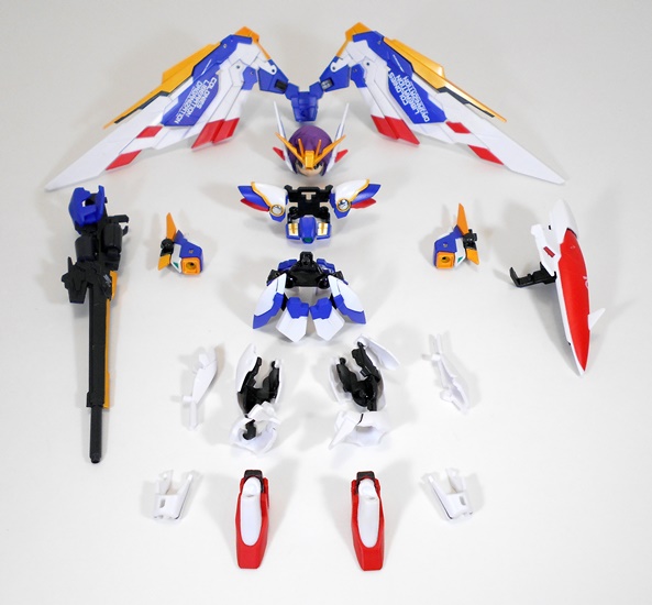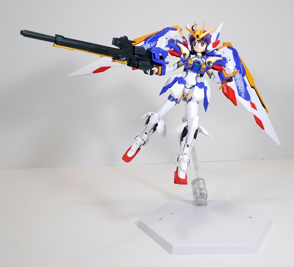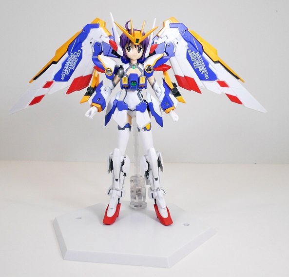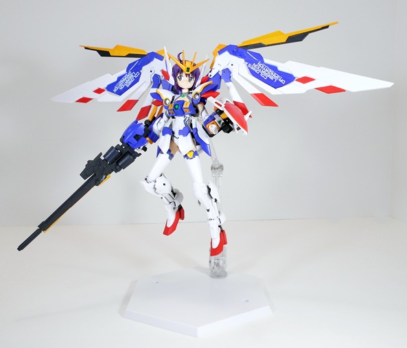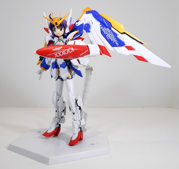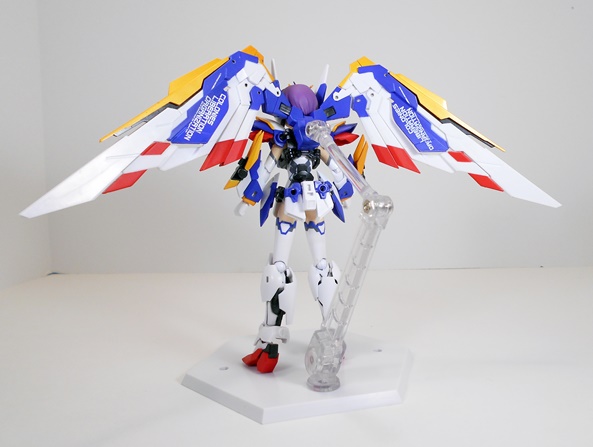 The wing assembly pegs in like a backpack with a “T” shaped tab and a hole in the back to accommodate the arm for the stand, and here’s where the stand really comes into play because the wings can make her a little back heavy and difficult to stand. They’re also absolutely magnificent and with them finally attached I can’t help but be in awe of how beautiful this figure looks. The iconic white, red, blue, and yellow coloring is so crisp and gorgeous and it’s made all the more spectacular from knowing I built this up from the base figure. The impressive wing assembly features hinges to allow them to be angled back and each individual wing plate is also hinged so that you can spread them out into a formidable plumage of cutesy mechanized death. And speaking of death, let’s talk weapons…