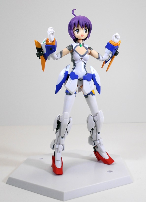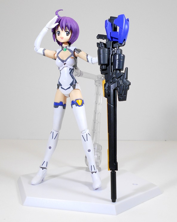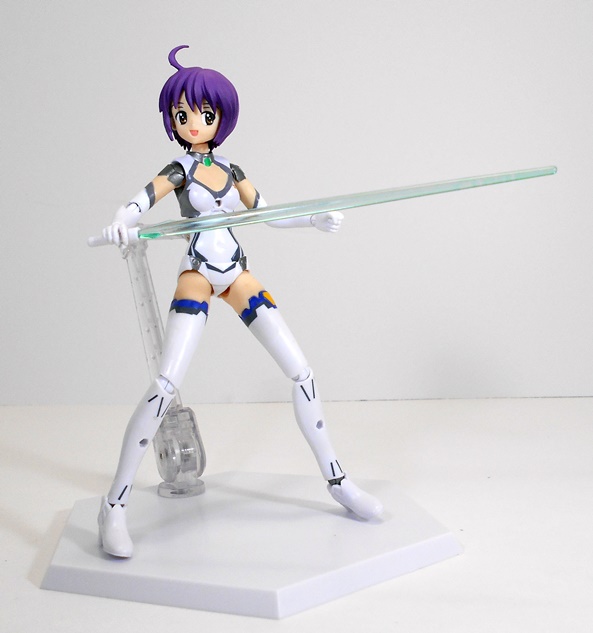 The base is a giant white hexagon with three sockets to accommodate stand arms, although the set only comes with one. It’s a clear plastic piece with hinges at the base, midway up and at the point where it pegs into the figure. The middle hinge can be a little weak, but the top and bottom are more than enough to support the figure when she’s all armored up. As for the extra weapon, it’s a Beam Saber, which is a fun accessory for the base figure to wield.