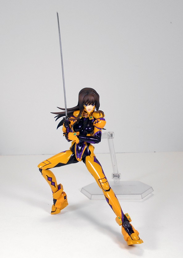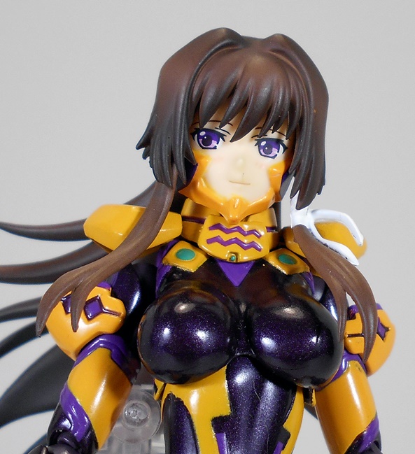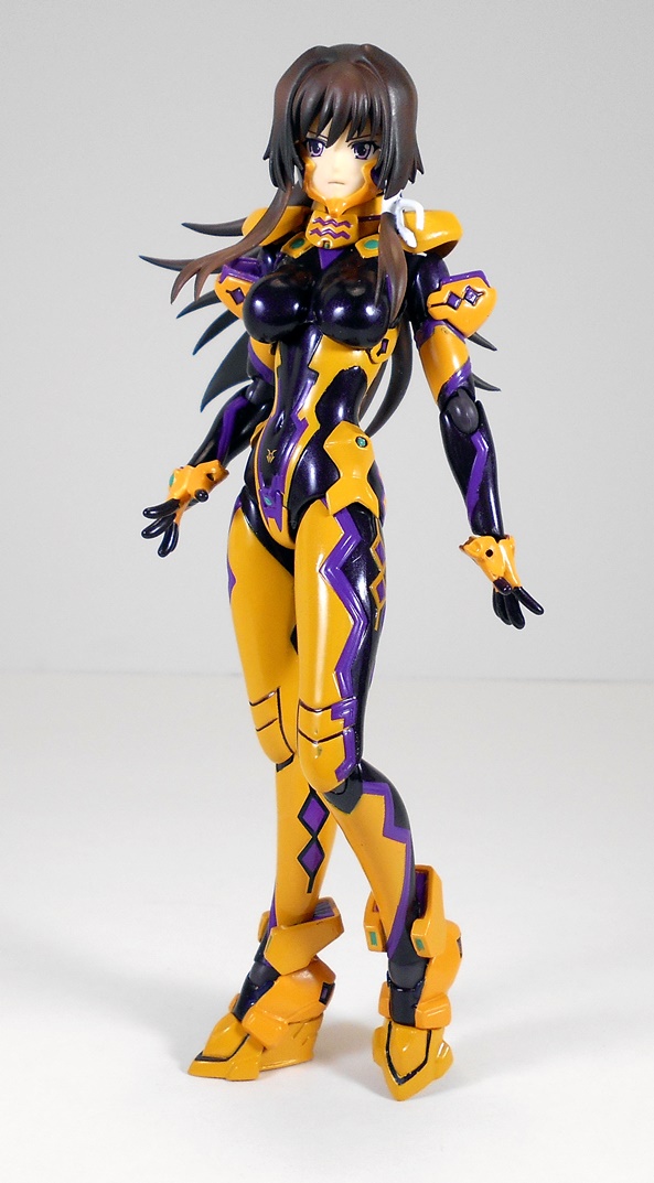 Yui comes clad in her Type-00 Fortified Pilot Suit, which is recreated here in splendid detail. It’s a design that manages to preserve her shapely curves and yet adds on some more angular armor bits in strategic places, like her boots, wrists, and shoulders. Every part of the suit’s detail, including the panel lines, are part of the sculpt and the mustard, black, and purple paint is beautifully applied with just the right amount of sheen. The only quality issue I can see on my figure is a little nick to the paint on her left knee.This is easily my favorite, and arguably the most distinctive, TSF pilot suit in the series, and this figure nails the look perfectly.