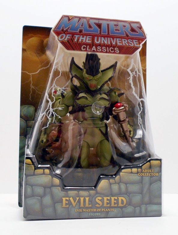 August was a busy, busy month for Matty Collector subbers, especially if you’re like me and have both the Club Eternia and 200x Subs. There’s no way I can pack all the goodness in before the end of the month, but if I get started now, I can make it before September’s goodies arrive. I’m kicking things off today with the MYP version of Evil Seed, a villain who is well loved from the original Filmation cartoon, despite being a one-off character. I remember that episode a little, but for the life of me, I can’t remember him in the MYP cartoon. I really do need to pull out those DVDs and watch it again, not only to jog my memory, but because it really is an awesome re-imagining of a cartoon that never really appealed to me.