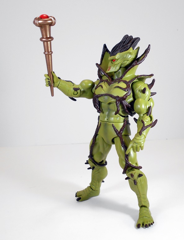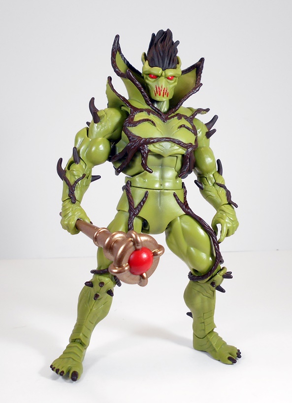 Despite all the new sculpting, Evil Seed retains all the usual MOTUC articulation. The arms have rotating hinges in the shoulders, hinges in the elbows, and swivels in the biceps and wrists. The legs are ball jointed at the hips, hinged at the knees and ankles and have swivels near the hips. The torso can swivel at the waist, has an ab crunch hinge, and the neck is ball jointed. I would have loved some lateral rockers in this guy’s ankles.