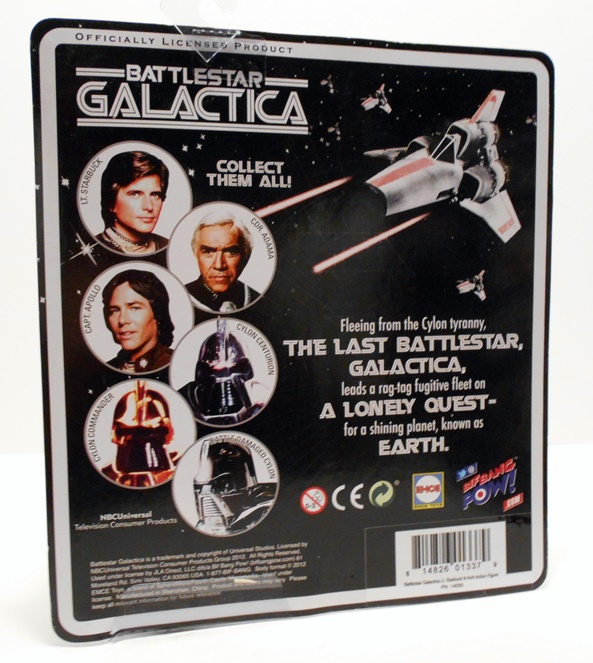 In typical Mego fashion, the figures come on simple cards and bubbles with the bubbles orientated to the right. The cards are made from quality, heavy stock and feature a starfield with an illustrated Cylon head, no matter which character is in the package. There’s a little personalization with the character name on the card, but even that is placed with a sticker.