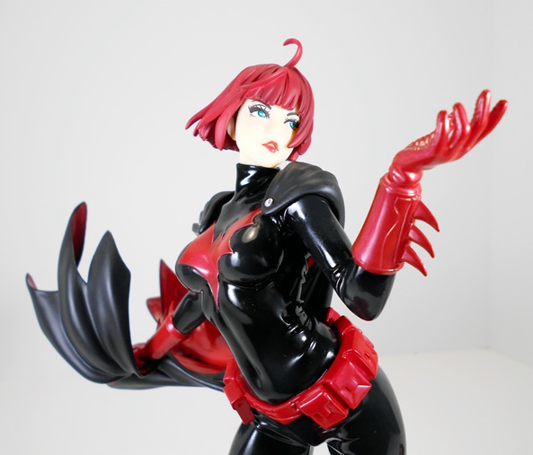The entirety of Kate’s bodysuit features a high gloss “new car” finish with a slightly less lustrous finish used for the red boots, gauntlets, belt and bat symbol. The cape switches things up with a matte black finish for the outside and a slightly more glossy crimson finish for the interior. I used to think the black and gold of Batgirl’s costume was the snazziest thing I’ve ever seen, but Ms. Kane here trumps it easily and a lot of that is due to Koto choosing just the perfect shade of crimson and the right balance of matte and gloss for this piece. Have I said it’s gorgeous yet? It’s gorgeous! I also love how Koto just busted out the silver paint for those two tiny shoulder clasps on the cape.