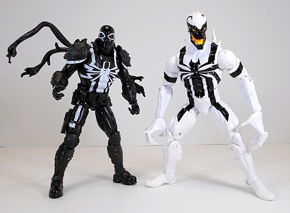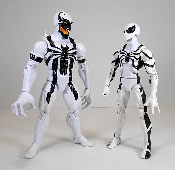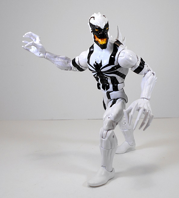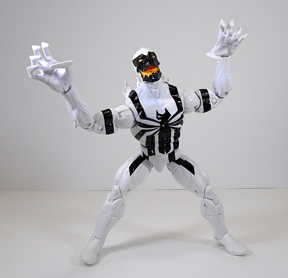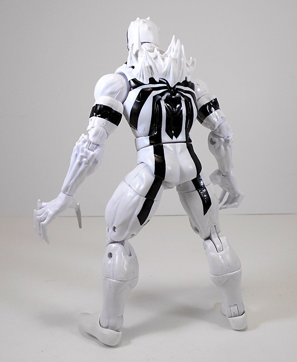I’m going to go out on a limb here and say this is a reuse of the Toxin body, which is certainly appropriate. Anti-Venom consists of a simple white buck with the black spider emblem painted on. The body has a bit of a chalky look in some areas, but overall it’s solid and the paint is sharp and clean with just one chip on the stripe running down the right side of his abs. Some might consider the deco bland, but I have a thing for monochromatic figures and Legends has brought us more than a couple.