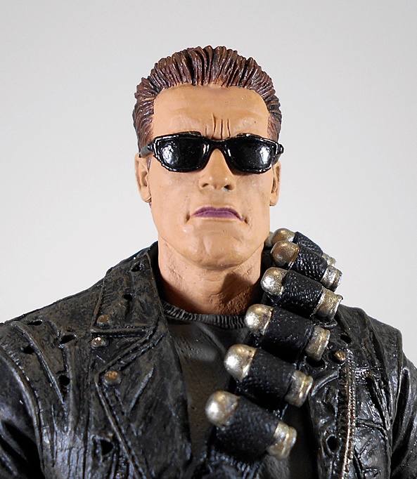 Next up, we have Arnold with shades. This is my favorite of all three of the portraits. I think the likeness is even better than the stock head and I like the more determined expression on his lips. The creasing between his eyebrows is more pronounced and the muscle definition in his chin is particularly good. This is likely the head that this figure will wear the most on my shelf, although I have been entertaining getting one more of these guys for a couple different display options, because…