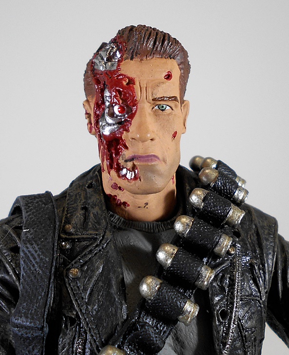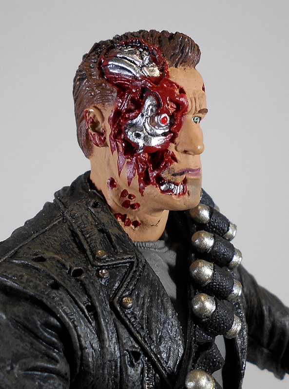 …ripped up cyborg head!!! This thing is a mess and I mean that in every positive way. The meat from half of the T-800’s head is blown off revealing the cyborg parts. The sculpt is fantastic, but what really sells this head is the paint, which is spectacular for a figure in this price range. Yup, if I buy a second one of these guys, this is the other head that will always be on display.