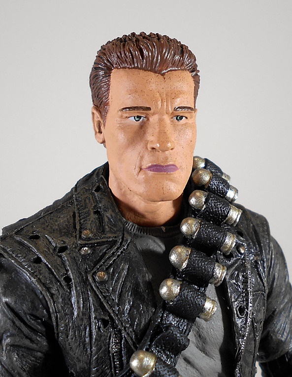 The T-800 comes in his bad-ass biker outfit looking like he just stepped right off the screen. The attention to detail on this guy is staggering. From the stitching and wrinkles in the pants, stitching on the gloves, to a jacket that uses every modicum of surface space to pack in more detail. The use of matte black for the pants, boots, and gloves and gloss black for the jacket is a welcome sight and the various silver zippers are all neatly painted on the jacket. This is one of those figures that clearly represents a labor of love on the part of everyone involved in its production.