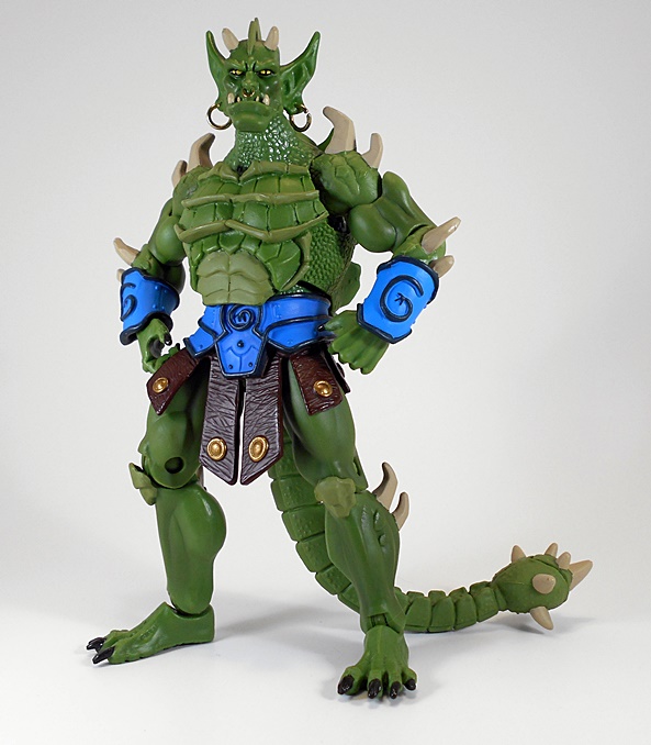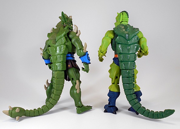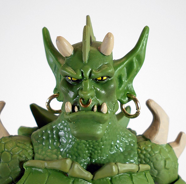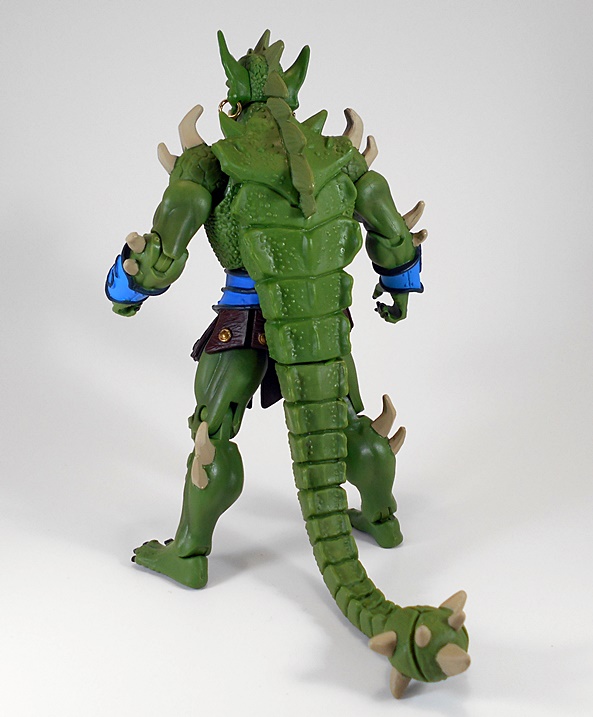 Ceratus is something of a lizard-dude, but I think he’s got a lot more of an Orc or Goblin vibe going on with the head. It’s an interesting design and while it borrows heavily from Whiplash, nearly everything that’s reused has been re-sculpted. The craggy, scaled shoulders, for example, have hooked horns added, and while that’s probably the same torso buried under there, the chest piece is brand new and sports some fantastic sculpted detail. Ceratus dons a rather skimpy outfit that favors showing off a lot of well-toned lizard physique. What little he is wearing consists of a blue belt with matching wrist bracers and leather-like flaps that hang down from the belt, sort of like a skirt. The texturing on these pieces is well done and each one features a painted bronze button.