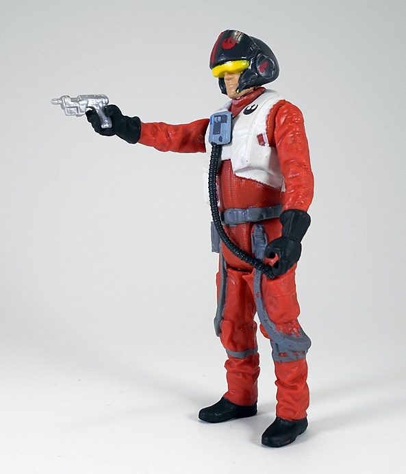 As this is the Space Mission Series, Poe comes in his X-Wing pilot gear, which pays homage to the OT flight suits, but still manages to be rather distinctive. The sculpt on the suit is pretty wonky and while there are some nice details, like the texturing and all the rumples, there’s something off about this figure to me. It kind of looks like it’s a poor custom job made from another figure using sculpey. The paint, especially around the white vest, is also rough. But hey, he does come with a little functional holster for his tiny pistol. I guess that’s something.