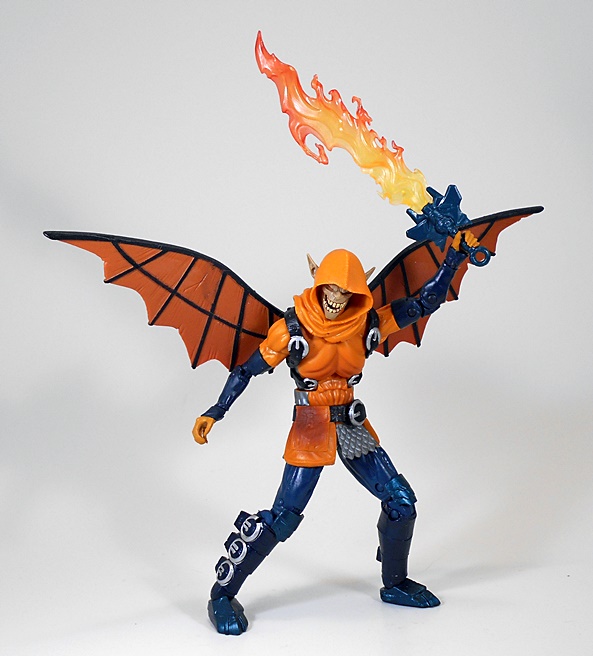 In addition to the sword hilt, Hobgoblin comes with an ignited sword and a flaming bomb. The flame sword is quite a work of art and is cast in a beautiful blend of translucent red and orange plastic. I can’t say as I’ve seen anything like it since Mattel’s Draego-Man from the Masters Classics line. He can hold it comfortably in his left hand and he looks great wielding it. Alas, I can’t show you the flaming bomb, because it fell on the floor and the cat dragged it under the sofa into his Lair with all his other plastic pretties.