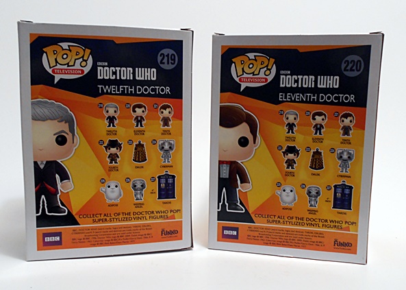 The packaging consists of compact little window boxes, showing you exactly what you’re going to get. From what I’ve seen, the trend in the Pop! collecting community is to display these deformed little fellars in their boxes, making it easier to stack and store when you have like 1,000 of them. Funko even makes clear acrylic cases so you can store your Pop!s in the box and in the case. A couple thousand years into the future archaeologists are going to have a great time trying to figure these things out. Anyway, these are numbers 219 and 200, from the Pop! Television Series. That’s as opposed to the two billion other series of these things Funko churns out. I swear to God, there’s probably a series of Pop! Vinyls based on people I used to go to High School with. The back of the boxes show the nine other Who Pop!s they’ve done so far, including a Deluxe Pop! TARDIS. And yes, I’ll be getting to all of them eventually. IT’S NOT AN ADDICTION! Let’s start with Eleven…