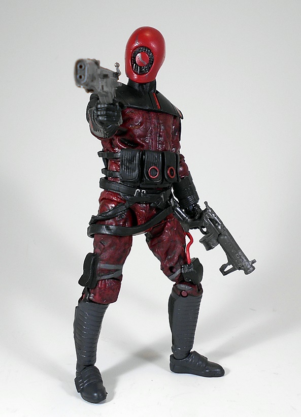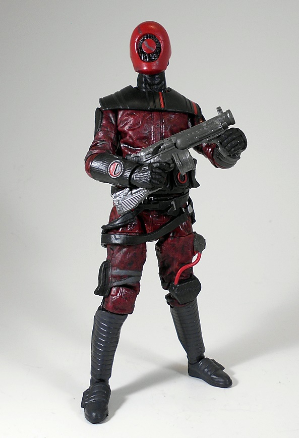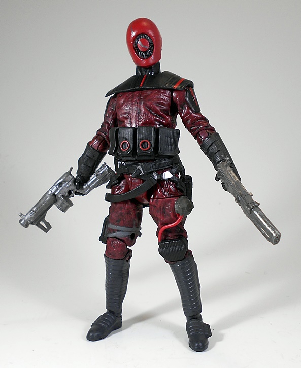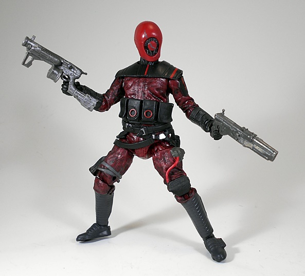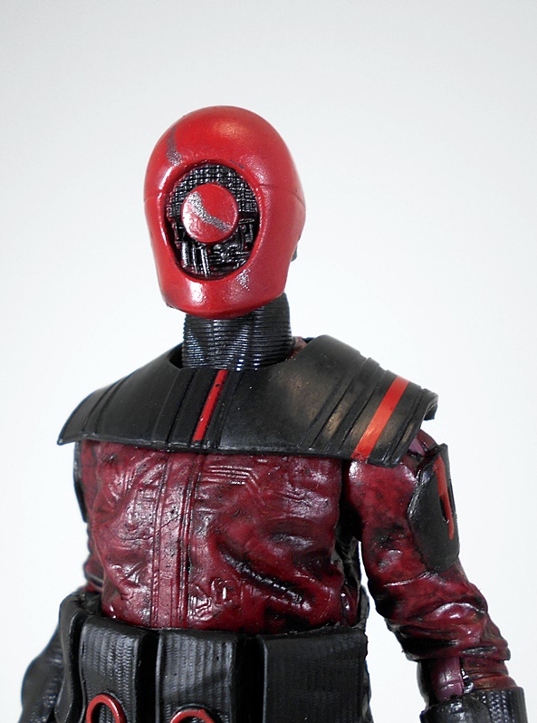 I didn’t know what to make of this guy before seeing the movie, but I really dig the design. The crimson suit features all sorts of texture and wrinkles as well as a wash to bring out that lovely detail. He wears a high belt of pouches across his stomach and a complex network of belts and straps around his waist. I’m not sure what’s going on with the cable pumping something either into or out of his left knee, but who cares? It looks cool. The back of the suit has a subdued circuitry-like pattern etched into it. There’s also some decent texture on the boots. If I had one complaint about The Enforcer’s design is that the feet are kind of small.