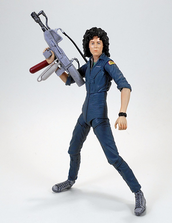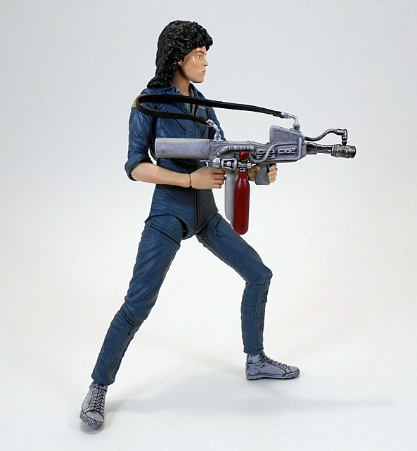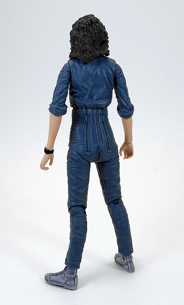 The back of the jumpsuit features a rather elaborate set of stitching that cinches around her waist and looks almost like a corset. The set and costume designs in Alien are so damn good they could even make something like a jumpsuit seem interesting. And leave it to NECA to pick up on all those little details and bring them out in the sculpt. The sleeves are sculpted to be rolled up just above her elbows, which is convenient for her articulation. In total, I count about 12 points of articulation. There are rotating hinges at the shoulders, elbows, and wrists. The legs are ball jointed at the hips and have rotating hinges in the knees and ankles. I think there are lateral rockers in the ankles, but mine appear to be fused. Ripley may be taking a dip in some boiling water at some point. There’s a ball joint in the torso and another in the neck.
