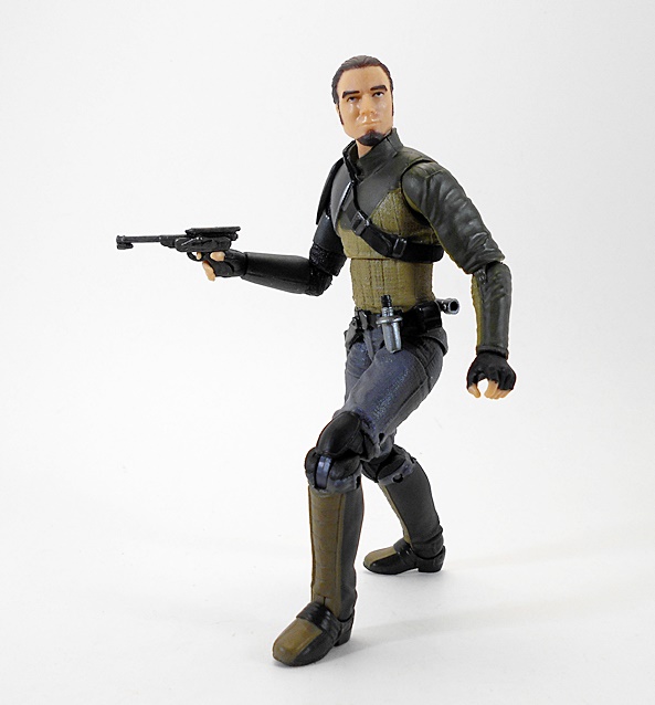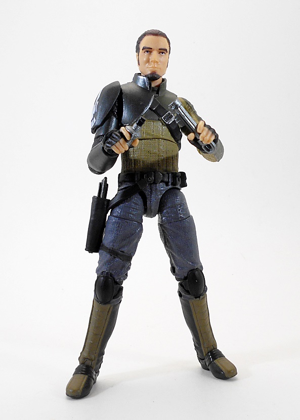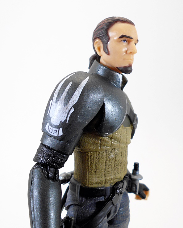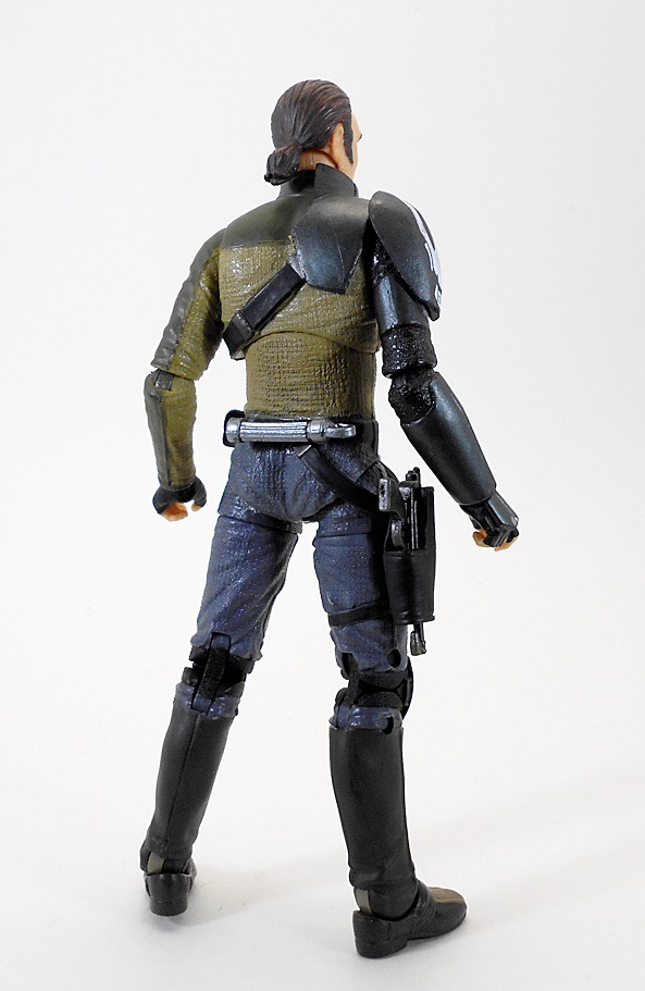 The armor on his right shoulder and arm looks particularly good. The paint is very convincing as worn metal and the added white insignia on the shoulder looks appropriately worn and weathered. The cross strap for the shoulder armor is sculpted as part of the buck and the fixtures are neatly painted. He also features a smuggler’s style belt with a low slung holster on his right hip. No doubt about it, this version of Kanan looks like he would be right at home swaggering through a backwater planet in the live action Star Wars Universe.
