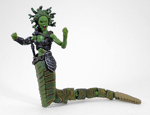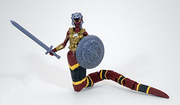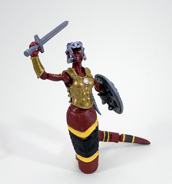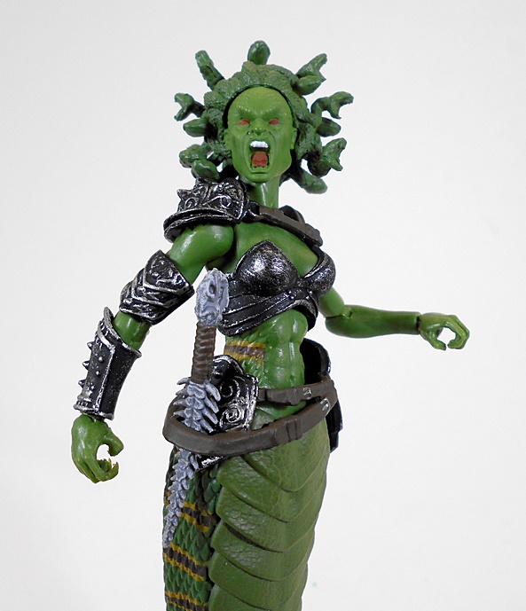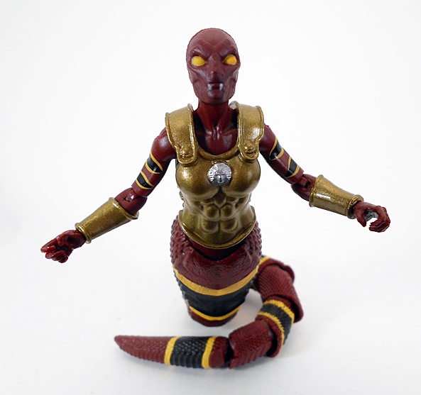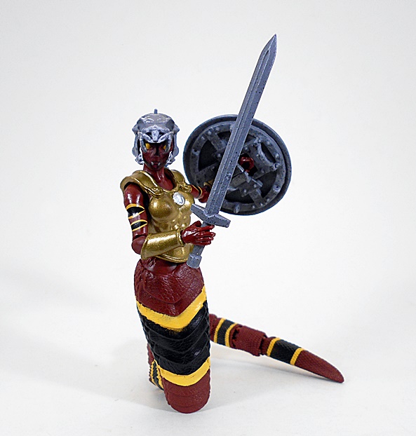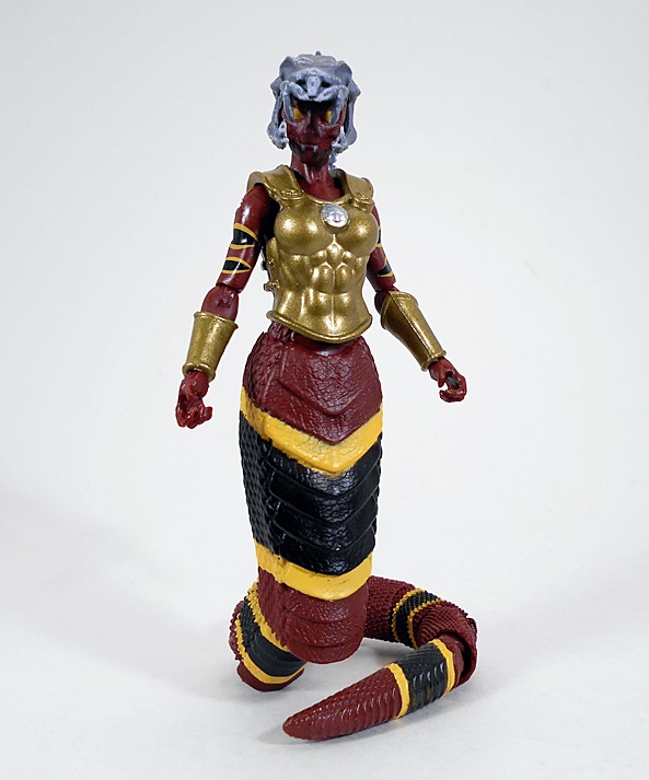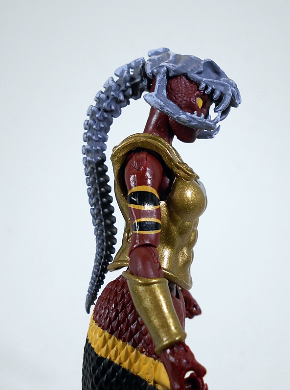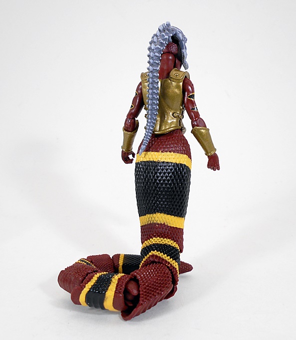 Wow, this is a unique and wonderful looking figure. From the waist up, she’s all woman. Below the equator, she’s all snake. The humanoid part of the buck is very nice and includes sculpted muscles in the abs and armor on the chest and shoulder as well as a wrist bracer on her right arm. She also wears a belt rig slung loose on her hips with a loop for her dagger on the right and an armor plate on the left. The sculpting and paint on the armor pieces represents some great work and gives it a realistic, worn patina and pitting. The tiny sculpted leather rigging that holds the shoulder armor is above and beyond for figures in this 4-inch scale.