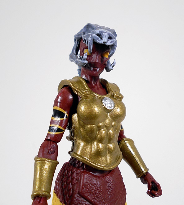 While we’re dealing with the same basic buck, there are so many changes here that the Coral Gorgon feels like a fresh figure. And nothing against Medusa, she’s awesome, but this Coral Gorgon is sporting one hot and sexy deco. You get a deep reddish-brown with some lovely black and yellow stripes, not only on the tail, but also on the biceps. Coral is also wearing armor consisting of a full chest and back plate with sculpted muscles and very similar to the style and color worn by the Spartan Warrior, only clearly designed with the female form in mind. She’s also got a pair of matching wrist bracers. The bright luster of the bronze armor is gorgeous when paired with this deco.