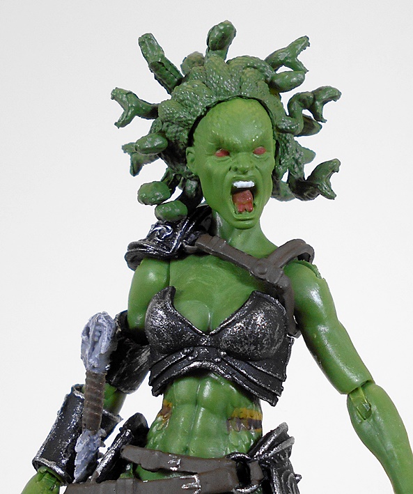 Insert ex-girlfriend joke here. This gruesome portrait is spectacular. Her mouth is open in mid scream, exposing her forked tongue and pearly whites. She has red, pupil-less eyes and her forehead shows some faint scaling. The head is topped off with a grizzly mop of snakes.