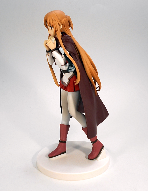 Asuna is posed leaning forward with one leg drawn back the other and her arms drawn up to her mouth and holding one of those cakes that was a common focus of one of her first meaningful exchanges with Kirito. Her fencing sword is mostly obscured by her cloak, but the hilt is visible peaking out beside her left elbow. I really enjoy how much work went into sculpting a weapon that isn’t obviously on display.