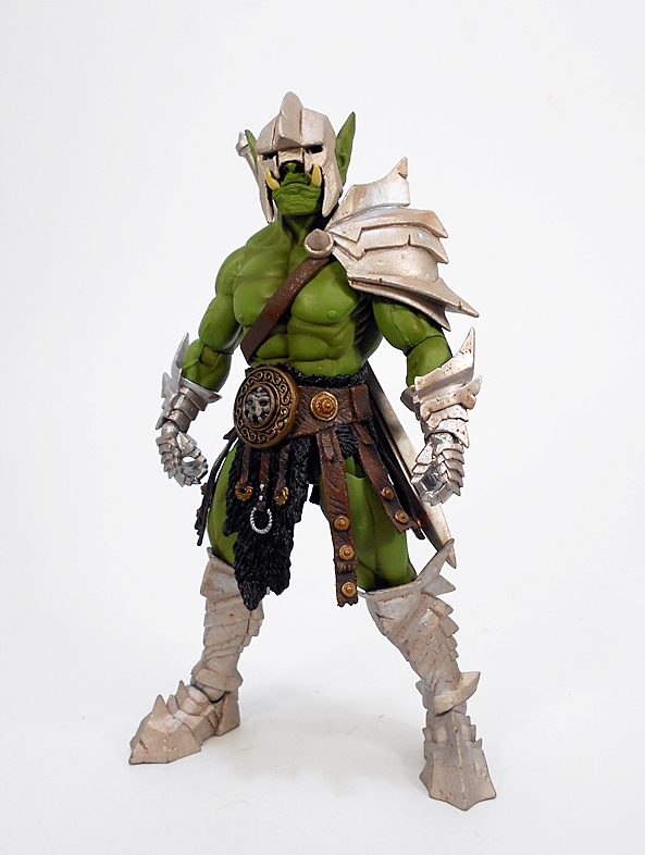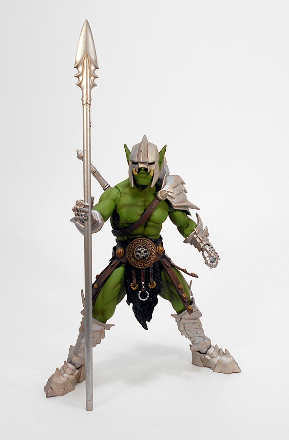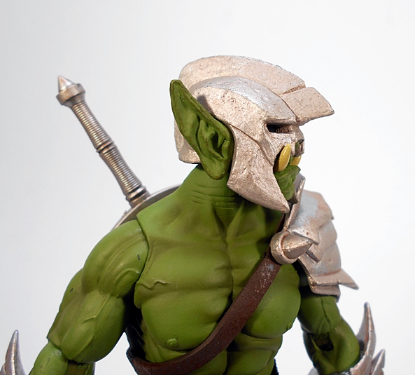 The head sculpt instantly reminds me of Lord of the Rings. The helmet looks like a crudely made piece of armor, as if hundreds of them were beaten out in mass production to quickly equip a disposable army of man-beasts. It only covers the top half of the face, allowing for the mouth and giant bottom teeth to protrude upward. It also displays his giant pointed ears quite nicely. The finish matches the worn and rusted patina of the rest of the armor and there are some nice bits of wear and pitting in the sculpt, as well as a nasty cut in the crest.