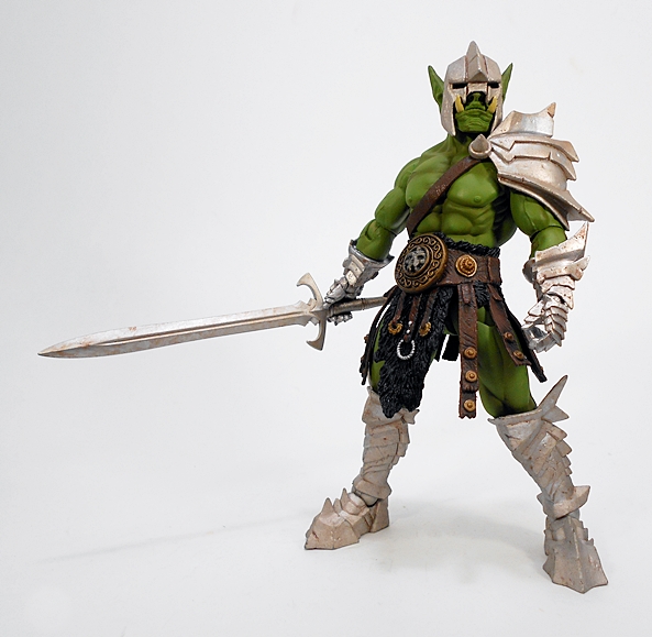 As usual, the figure comes packaged without its shoulder armor, which allows for a good look at the first bare chested buck I’ve covered. Indeed, if you’ve been following along from the beginning than you’ll likely note that all the sculpting on this guy is fresh and new, introducing us to some more parts that we’ll see again in the future. The chest, most of the arms, and the upper legs are bare and cast in a very nice shade of green. The musculature and veins are very well defined and we even get some Orc Nipples, if that sort of thing floats your boat. Not judging! Urkku wears a rather large and intricate belt suggesting that he’s the Champion of some kind of Mythic Fighting Legion. Seriously, though, there’s some beautiful sculpting on that belt and it extends to the strips of leather that make up the skirt and the clump of animal fur that forms his loin cloth to protect the modesty of his private Orc bits. All the details on the belt are beautifully painted. The gauntlets and boots are made up of some seriously chunky and vicious-looking segmented plate armor with a particularly satisfying patina of rust and some nicks and scratches in the sculpt. Urkku comes with the same style sword belt as Gideon and Skapular, but you’ll note that I opted to put his on as a shoulder strap.