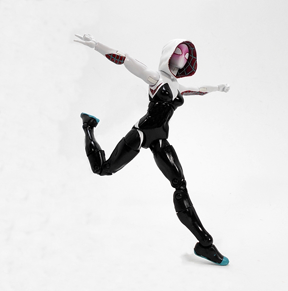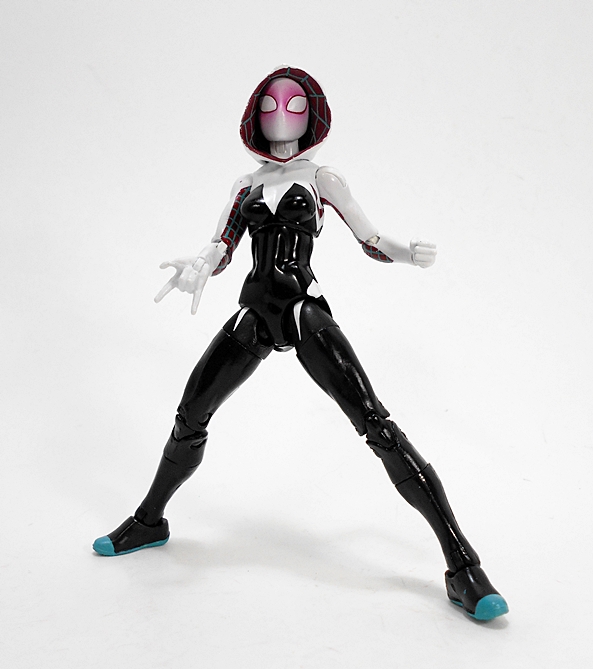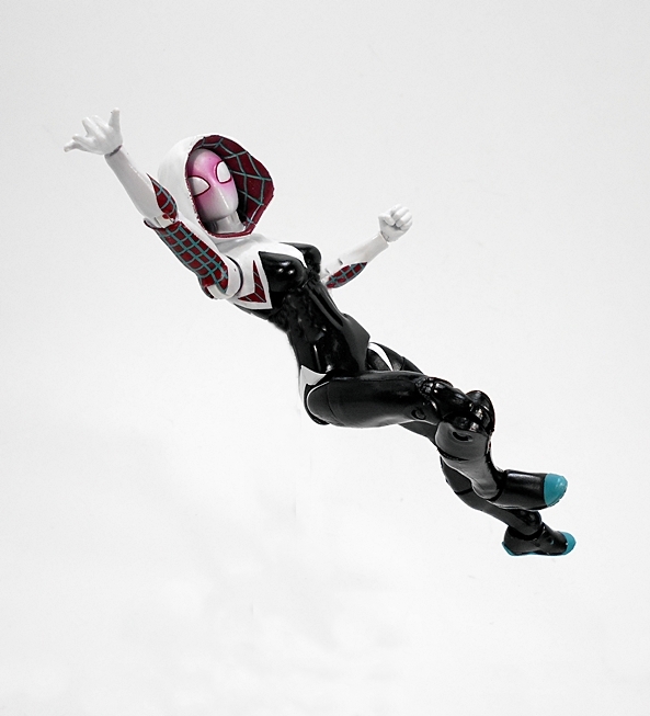 Unfortunately, Hasbro still isn’t on the ball when it comes to the articulation of many of their female figures. Here’s what you get: The arms have rotating hinges in the shoulders, elbows, and wrists. The legs are ball jointed at the hips, with swivels in the thighs and lower legs, and double hinged knees. The ankles have hinges and lateral rockers. There’s a ball joint under the chest and the neck features both a hinge and ball joint. Some of the biggest omissions as far as I’m concerned are the swivels in the biceps and double hinges in the elbows. Also, the lack of a waist swivel is a bummer. In some characters, those fewer points don’t always matter as much to me, but in the case of Spider-Gwen, the reduced pose-ability really hurts