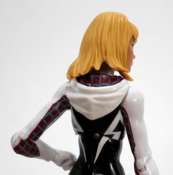 Her costume is simple enough and from the neck down the costume is achieved entirely through paint. The deco is largely black on white with some spider web patterns under her arms and inside her hood. Also, the soles and toes of her shoes are blue. The paint is fairly solid, although the lines could be sharper and there’s a little yellow discoloration on my figure’s chest and shoulder area.