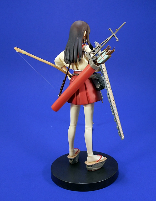 Akagi stands at attention with her Yumi held at rest in her left hand and her right hand clutching an arrow to her chest. I strung the bow a little snug to show its curves. Like all the Fleet Girl Carriers, Akagi’s costume is strongly influenced by Kyudo garb, which ties in with the fact that the Carriers in KanColle function as archers with long-ranged attacks. Sculpted details feature some nice touches, including the strings that hold the armor pieces in place, the ruffling of her loose top, and even little wrinkles in the knees of her stockings. The coloring here isn’t terribly vibrant, but the combination of red skirt and quiver with the slightly off-white blouse and stockings is attractive enough. You also get some very neatly applied silver fixtures on her belts and straps.
