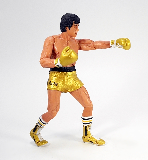 This is Rocky as he appeared in the first fight with Clubber Lang, where he got his ass kicked. I can still remember the first time I saw that fight in the movie. I was young and I recall feeling scared shitless for him because Clubber was so intimidating. Rocky sports his yellow/gold trunks, gloves, and high tops and dammit, there is some really fine detail going on here. The gloves and shorts look like the real thing thanks to a beautiful coat of paint and some sculpted stitching and wrinkles. From his name on his shorts to the elastic waistband, this is great stuff. The same goes for his footwear, which feature the same amazing gold paint and “ROCKY” printed across the backs of the high tops.