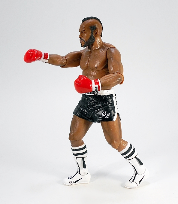 As far as 80’s film antagonists go, Clubber Lang is surprisingly high up on my list. That’s a testament to the script writers and Mr. T’s performance. I really hated this guy. He was an animal and he showed absolutely no respect to The Italian Stallion. Everything I said about the Rocky Balboa figure can be applied to this one. The colors may not be as flashy, but the black and white shorts and white and black footwear look great. He has “CLUBBER” printed across his waistband and his initials printed down on the left leg of his shorts. I really love his gloves. The red paint here is so vibrant and like Rocky’s they have “TUF WEAR” printed on them.
