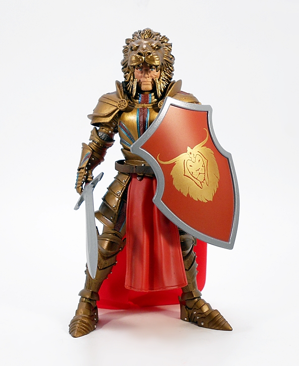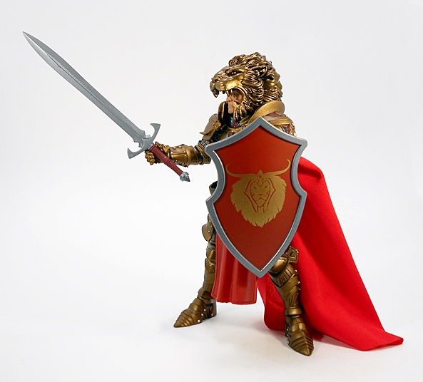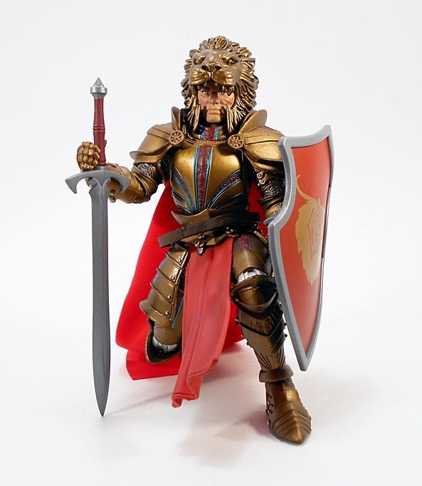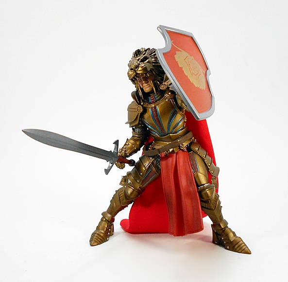 Naturally, Atilla comes with a bunch of weapons, all of which we’ve seen before. The sword is the larger, two-handed one, with a slightly leaf-shaped blade, a stylish crossguard, and a maroon painted grip. The shield features a wrist clip that pegs on so the shield can be orientated in any position no matter the position of the arm. The crest here features a bronze lion head painted on a field of maroon, which matches his armor quite nicely.
