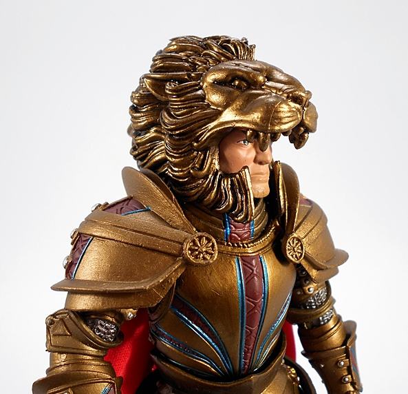 But that’s OK, because the real draw here is Atilla’s stunning lion head helmet. I’ve always been a fan of these style helmets, where the face is positioned inside the jaws of the beast. In this case, the top of the lion’s mouth forms a jutting visor over Atilla’s brow, while his cheeks are flanked by the lion’s mane. There’s no bottom jaw, just Atilla’s exposed, stubble-covered chin. Both the sculpt and the paintwork here conspire to make the helmet look like it really is forged in bronze. It’s an important distinction, and one that deserves to be called out. T4H didn’t just sculpt a lion head and paint it, they sculpted it to look like it was hammered out of metal and it looks simply fantastic. This helmet may be the most impressive piece of sculpting in this entire line so far, and that’s really saying something, because it’s all been pretty amazing.