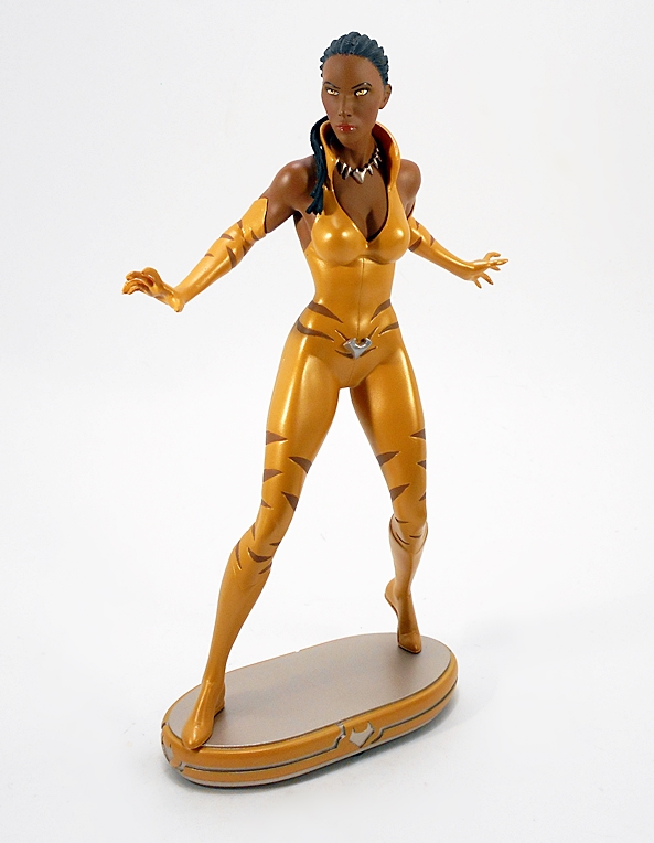 This line continues to use simple and standardized oval bases, in this case personalized with an animal head cut out at the cardinal points. It features a silver top and stripe and the edges are painted to match her costume. The limitation is hand numbered on the bottom of the base. Mine is 874 of 5,200.