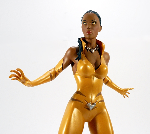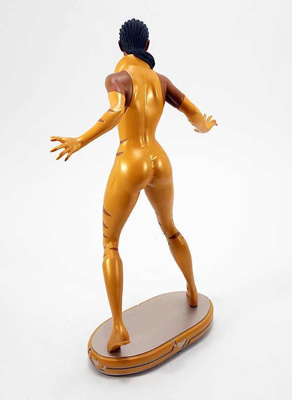 Vixen sports her rather simple body suit with sculpted cut-outs to resemble animal stripes, and long sleek gloves. You also get some sculpted seams, boot lines, and whatever that strategically placed silver fixture is right above her you-know-where. The paint on the costume is almost entirely… ochre? Is that what you’d call that? Yeah, let’s go with ochre… with a hint of metallic sheen to it. There’s also a low plunging neckline for those of you who like a little sumthin-sumthin with your lady statues.