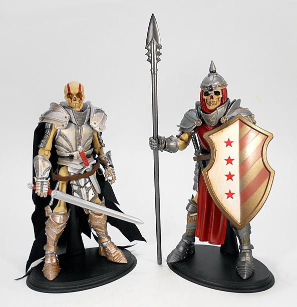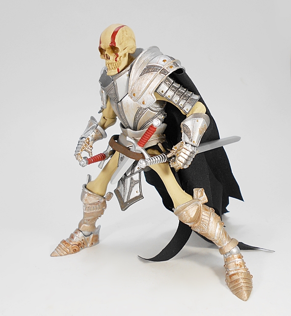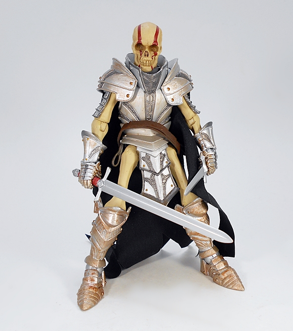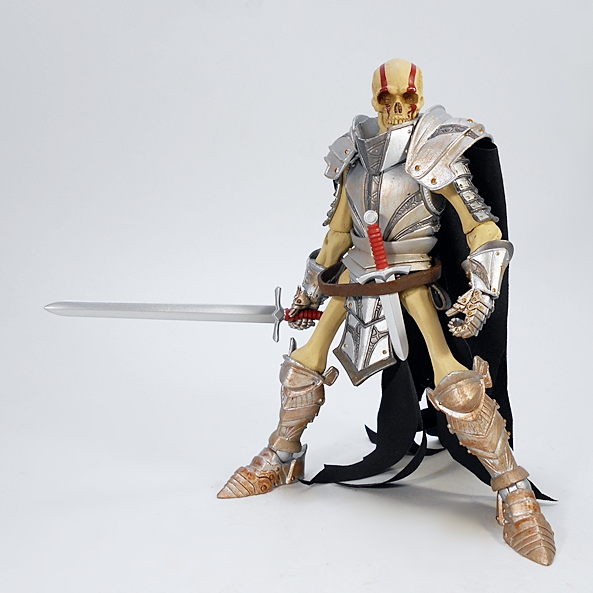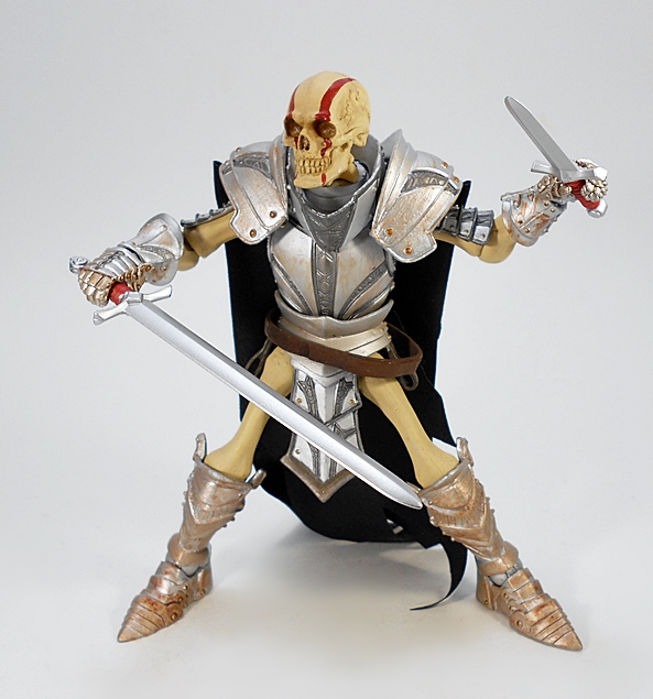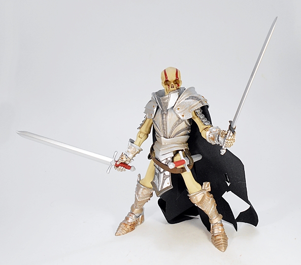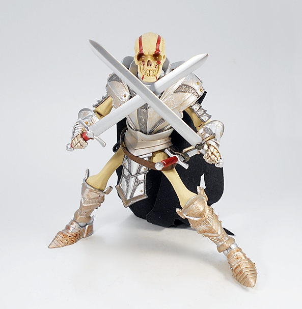 Yes, much like his bony chum, Skapular, Tibius is a skeleton knight and you should recognize a lot of the parts here from Mr. Skappy. It’s OK, we’re bros, I can call him that. The arms, legs, neck, and groin plates are all taken directly from that figure, but the tabard covered chest piece has been replaced with the full on plate armor that we’ve seen used for all the knights. The bone pieces are straight-up recycled while the armor has a more of a tarnished silver paint scheme going on. I like it a lot, particularly on the lower legs. It looks like he just pulled himself out of his Crypt. Perhaps it was the very same crypt that Skapular broke. This is not the flashiest armor we’ve seen, but I think it suits him.