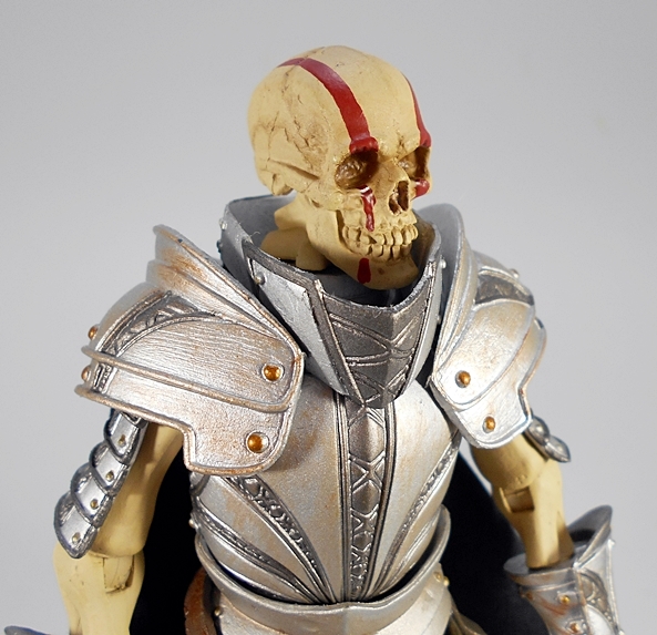 The portrait here is a new one. Tibius’ noggin is a simple, but beautifully sculpted skull painted with the same yellowish finish as the rest of his bones. There’s some rotten carmel-colored paint in his vacant eye sockets and you get some cool crimson war paint in streaks down his face. When I say war paint, I’m just speaking figuratively. I’d actually like to think that it’s the blood of his enemies.