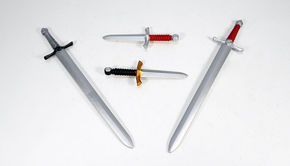 One set of sword and dagger are painted with red grips to match each other. The others vary enough so as not to look like a matched set. I will probably end up displaying this guy with the matched set and give the others to someone else, although he does look like quite the bad ass when dual wielding the swords, so that plan may change.