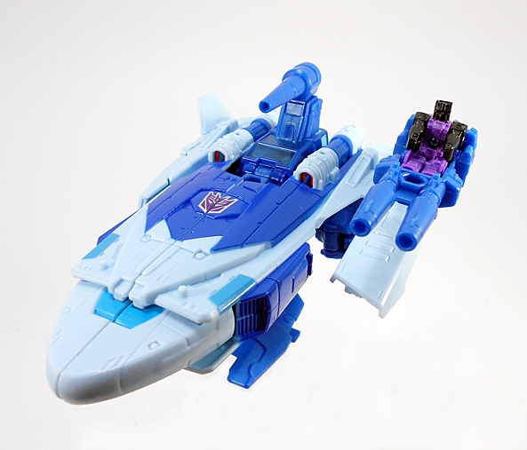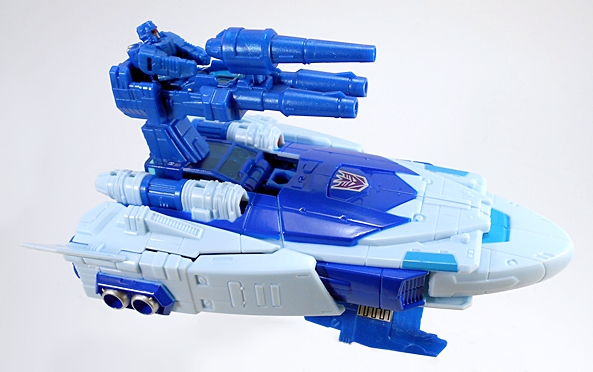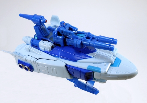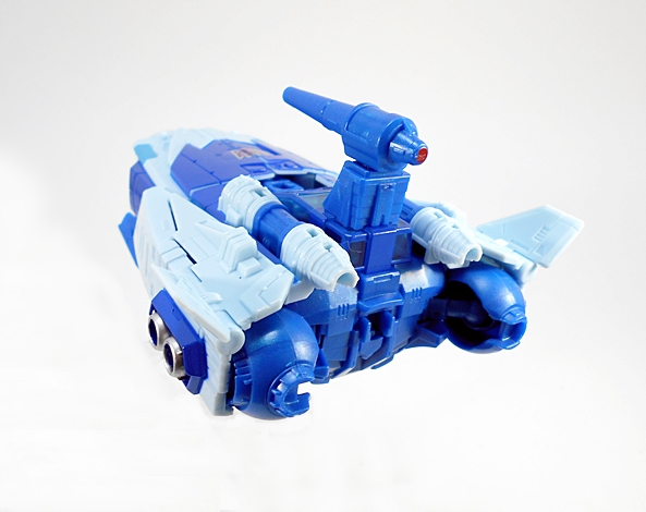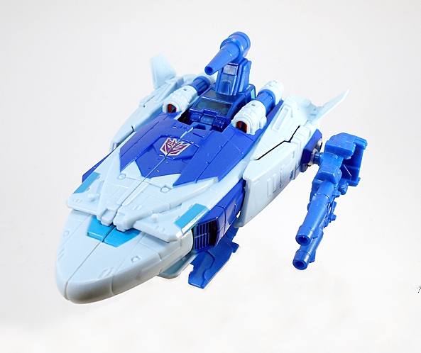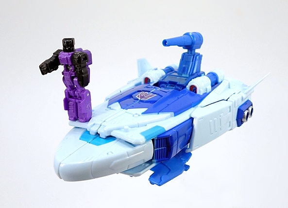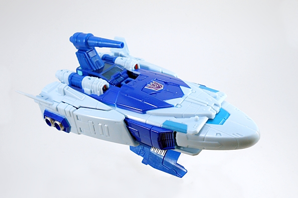 Straightaway, this is a much better homage to the G1 toy and Sunbow design than Generations Scourge. The close-but-no-cigar stealth bomber alt mode is gone and in its place we have a flying space boat that is very much like the old Scourge I know and love. There’s an adequate amount of sculpted detail here, including panel lines and vents, and the multiple shades of blue are right on point. I’m pretty sure the official configuration of the top of his tower is to have the elongated end point backward, but I prefer it to point forward, making it more gun like with the red bit at the other end serving as a thruster. You get a little silver paint here and there and a nice, bold Decepticon emblem printed right on top. Granted, there’s not a lot more to say about this mode, but it makes me a happy old TransFan.
