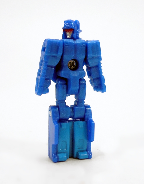 Fracas is a tiny blue robot with an upside down face sculpted on his back… I wonder what that’s all about, eh? You get a little paint on his legs and some surprisingly good paint on his minuscule face. He has articulation in the neck, shoulders, hips, and knees and a giant screw in the middle of his chest.