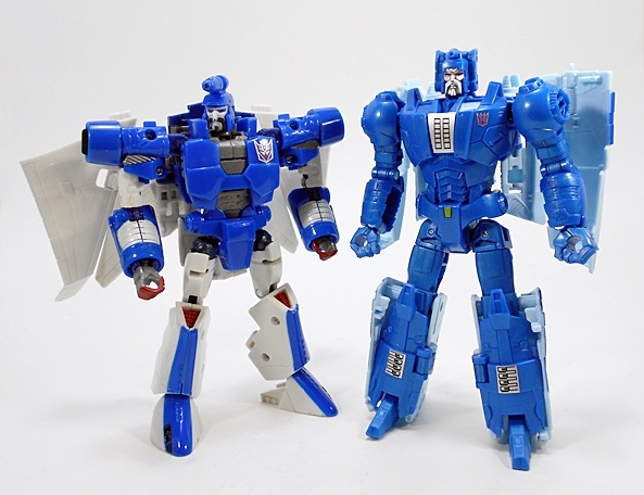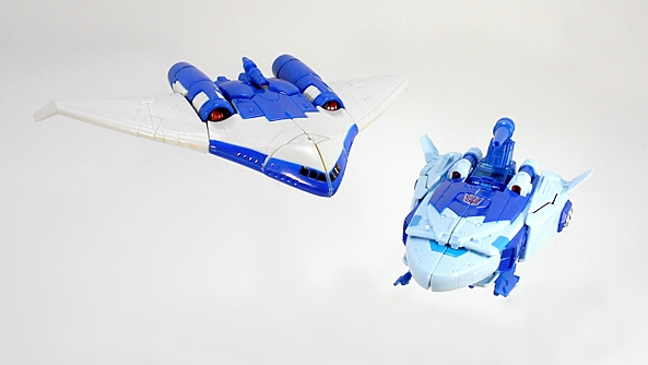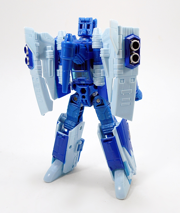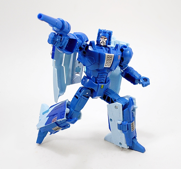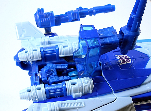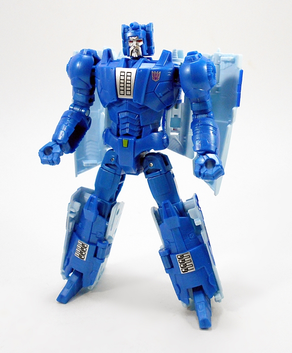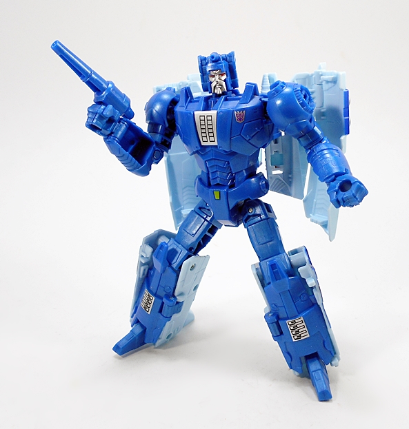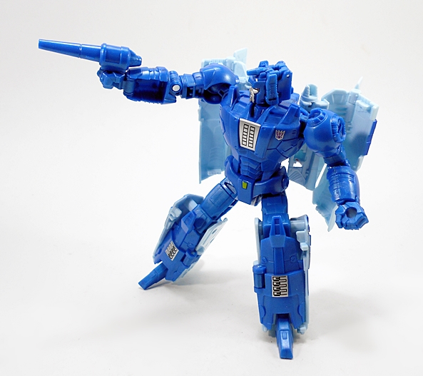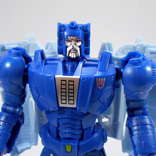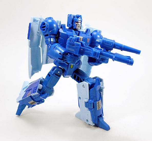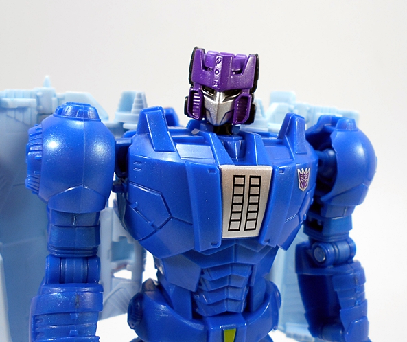 In terms of coloring, Scourge hits all the right points, but he shares the same notable lack of paint apps as Blurr did. You do get some detailed silver panels on his chest and lower legs, which simulate the stickers on the original toy, but apart from that his front is just a whole lot of blue with a the lighter blue showing on his wings and lower legs. From the back, however, he does show off a lot more color. All in all, I think the coloring here looks fine.