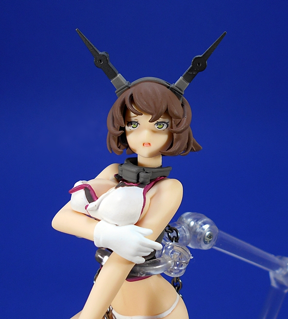 The portrait here is excellent, but then I’m biased because Mutsu is my favorite of all the Fleet Girls. I just think she’s adorable. Here we see her hair a little more ruffled than on the regular release, and she has her long antenna protruding from the top of her head. When viewed from dead on, her expression makes her look rather weary from returning from a hard fight. If I look at her from a little above, she seems to have a more determined look. Her green eyes are perfectly printed and her mouth is slightly open. She’s also very nearly busting out of her torn top. The face is a standard removable Figma style and is interchangeable with the regular Mutsu Figma, which is a really cool bonus if you’re like me and couldn’t resist picking up both. The head is also ball jointed, although it’s restricted mostly to turning from side to side.