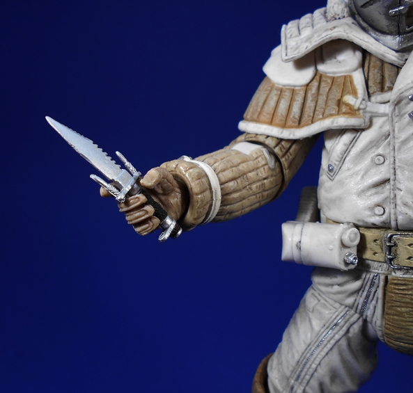 The Commando comes with two weapons. First you get a pretty cool little bayonet-style combat knife, which tucks into a slot in his left boot. There’s a tiny socket on the pommel and for a minute I was hoping it would attach to the rifle, but alas it does not. Neither of his hands are really designed to hold it, but I’m able to make it work in his right. This knife features some nice detail work, including a serrated back blade, but as vicious looking as it is, I have to imagine you need to be pretty desperate to pull this thing out when fighting Xenos.