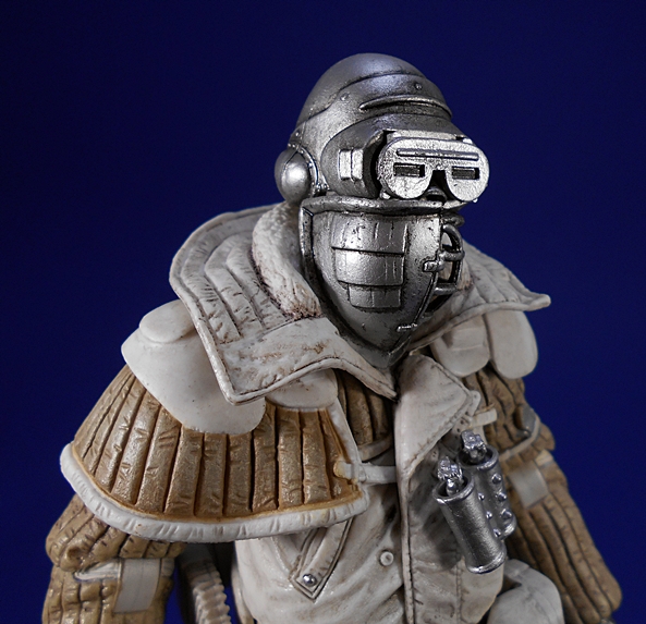 The helmet is every bit as distinctive as the suit. The upper part of the head is fully enclosed, while the lower half is partially covered by a full plate and partially by a caged section. Through the cage you can make out the lower half of the figure’s face, wrapped up. It may not be pretty, but it’s sure to keep those pesky facehuggers out.