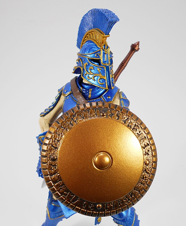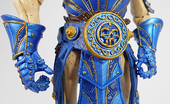 Just check out that detail in the gauntlets and belt. Yeah, this belt continues to be one of my favorite pieces in this collection. It’s not just that it looks so good, but it’s so versatile. T4H have made it work as a tribal looking folksy Orc belt and here it looks like a regal piece of gladiatorial garb. Here we can also see that they used a slightly darker blue, almost purple, to fill in some of the patterns. And yes, even the tiniest rivets on the gauntlets and boots are individually painted gold. There’s also a sword loop on the right hip should you want to make use of it.