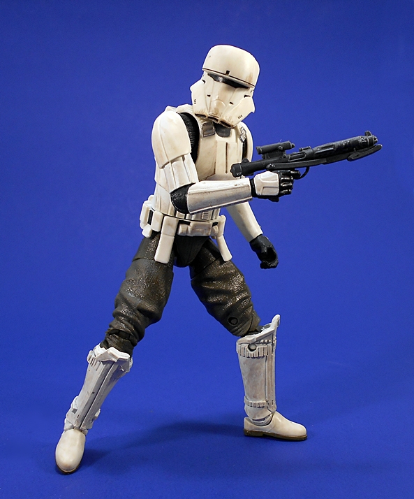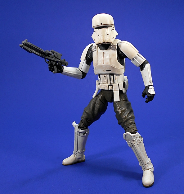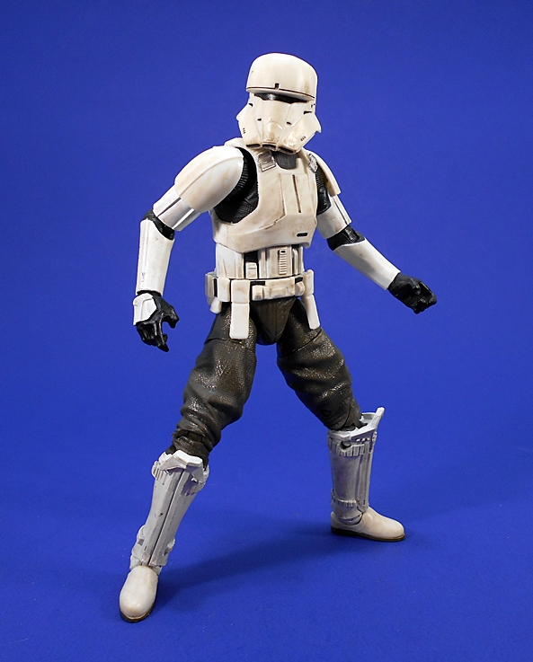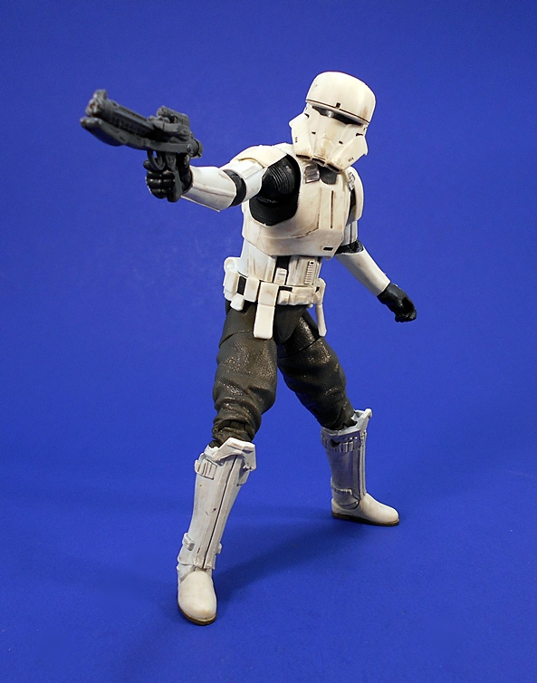 The armor on his arms, mid-section, and belt are very evocative of your more traditional Imperial troop armor. The chest and back plates are different, with a more deliberate look to the sculpt on the front and a vented integral backpack on the back. I like the sculpted straps that connect his chest piece and back plate. All of the armor plates on this guy are colored off-white with an effective paint wash that makes him look nice and grungy. The exposed under garment between the armor is pretty typical of regular Stomtroopers, but his exposed trousers are brown. He retains that familiar “bed-roll” tube on the back of his belt.