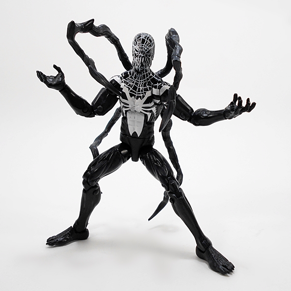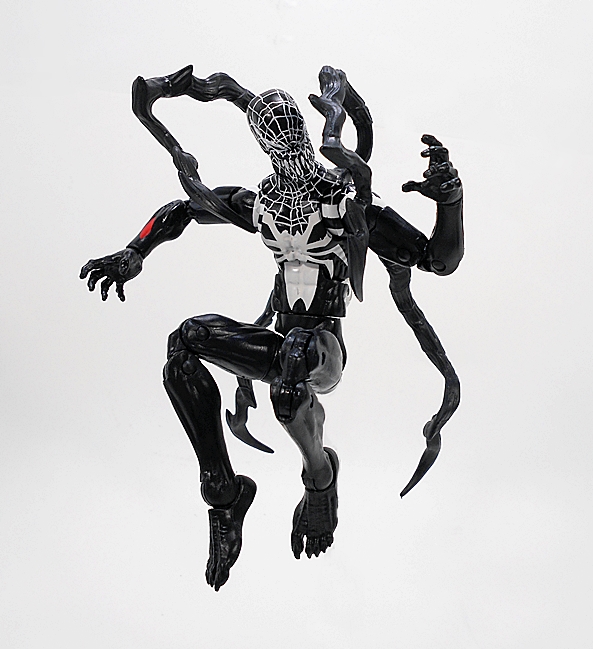 On the back, Otto-Venom features a fixture to attach his four tendrils, and here’s where the figure takes a big stumble for me. The tendrils each have uniquely shaped pegs that go into their own specific holes on the back. That helps a lot when figuring out which one is supposed to go where. Unfortunately it also means the tendrils are pre-posed. At the very least, these should have been ball jointed, because these things do tend to get in the way of posing the figure, not to mention are limited themselves as being totally static. They also fall out… a lot. I had similar issues with the Legends Agent Venom, although it didn’t seem to bother me as much there as it does here.