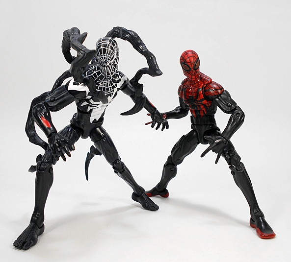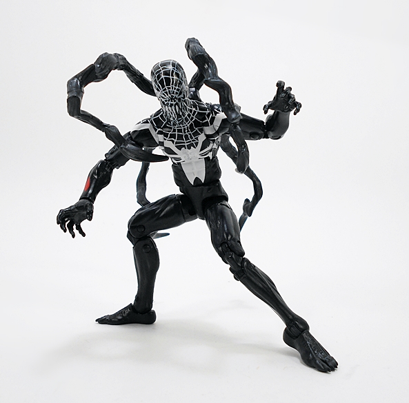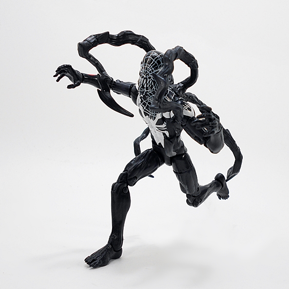 Superior Venom is mostly a reuse of the modern Spidey buck, which is a fairly reasonable choice. No, it doesn’t quite match the stylistic proportions of the comic art, but I wasn’t expecting an entirely new figure for that purpose. We do get newly sculpted feet, obviously a new head sculpt, and the rest of the symbiot’s detail is mostly achieved through paint. You get some red highlights on his forearms and the white spider emblem on the chest and webbing that runs up to his head. The white paint is mostly nice and bright, without a lot of bleed through from the black plastic. There are a few chips here and there, but nothing terrible.