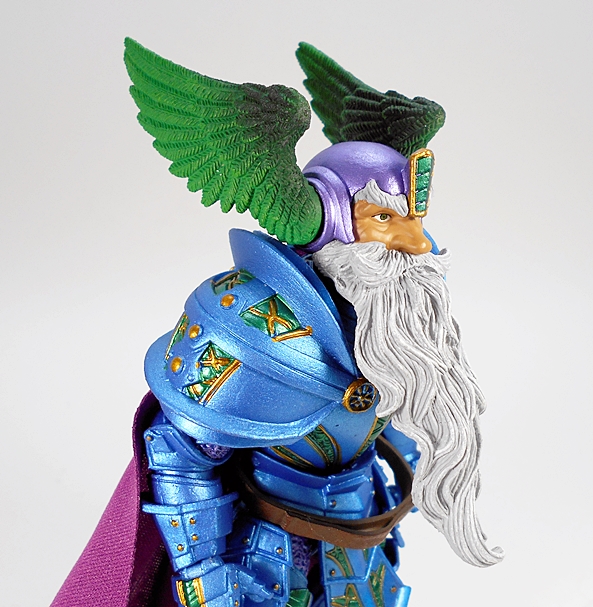 I was expecting this portrait to be a straight repaint of Thord Ironjaw, but I was pleasantly surprised. The face looks the same, but the sculpt of the beard and mustache and bushy eyebrows are all new. The head gear is also new, with a smooth, rounded helmet and a crest above his forehead. The wings are repaints of the ones we originally saw worn by Sir Gideon Heavensbrand and they look quite nice here.